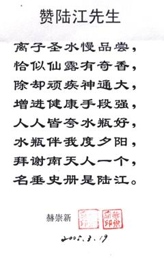 3. 詳細(xì)了解請(qǐng)上網(wǎng),可見臨床報(bào)告,鑒定證書、專家評(píng)說、治病機(jī)理、用戶反饋、題詞、詩歌、錦旗等彩色掃描件,被譽(yù)為"神奇水瓶"。
