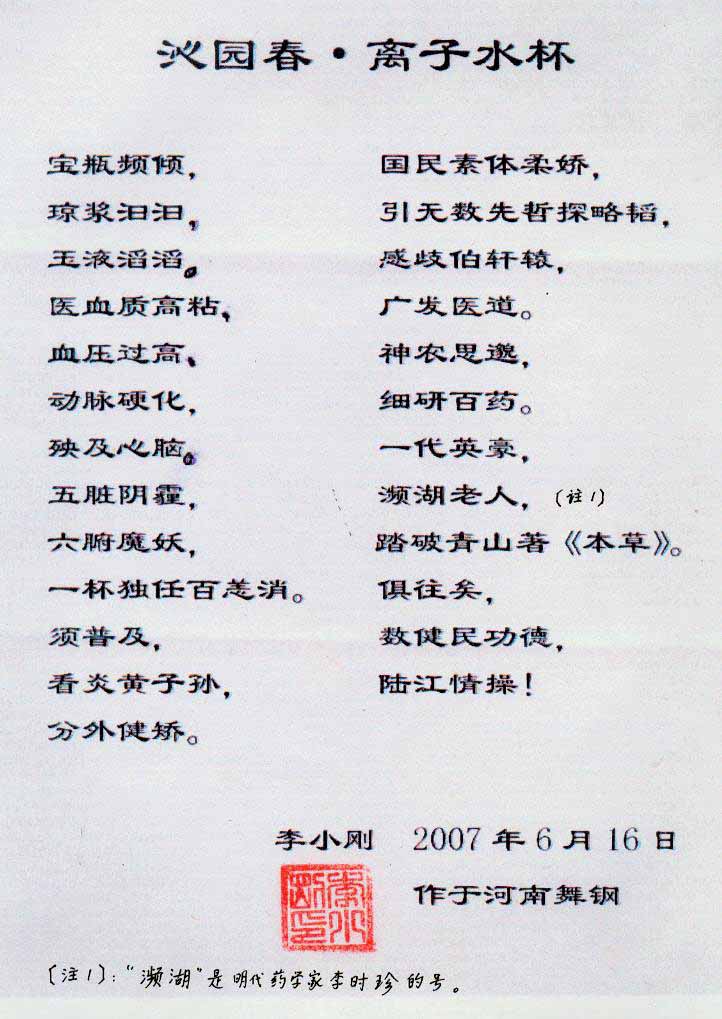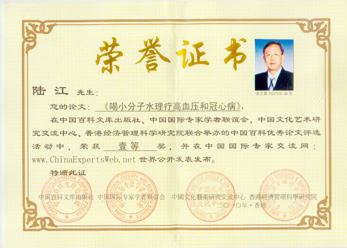 -----我是從事建筑的高工,本來沒有資格去攻克醫(yī)學(xué)難題,卻為了自身健康才扣響醫(yī)學(xué)的大門。由于我1990年患高血壓,因怕中風(fēng)才研究發(fā)明了離子水瓶,我把水處理成微小分子團(tuán)水,飲用后治愈了高血壓。便于1993年底送到三家省級(jí)醫(yī)院做臨床試用4個(gè)月。經(jīng)北京和廣西醫(yī)學(xué)專家鑒定:"降脂降壓效果好"," 能擴(kuò)大心腦動(dòng)脈流量,改善心腦電圖以及微循環(huán)","對(duì)治療心腦動(dòng)脈粥樣硬化、高血壓、高血脂有良好的醫(yī)療保健作用。""產(chǎn)品的技術(shù)性能和療效達(dá)到了同類產(chǎn)品的國(guó)內(nèi)領(lǐng)先水平,經(jīng)廣西醫(yī)學(xué)科學(xué)情報(bào)研究所檢索,未見國(guó)外有類似報(bào)道。"中國(guó)醫(yī)學(xué)科學(xué)院張正國(guó)教授從美國(guó)國(guó)立醫(yī)學(xué)圖書館數(shù)據(jù)庫存Medline檢索英俄文資料,均未見類似報(bào)告。2000年上市后,我為了對(duì)消費(fèi)者負(fù)責(zé)而繼續(xù)觀察研究,一直通過《信譽(yù)卡》和《質(zhì)量跟蹤調(diào)查書》向患者承諾療效,請(qǐng)用戶使用6個(gè)月后反饋效果。和脂壓患者飲用2至5個(gè)月內(nèi),消除癥狀,停服藥物,血壓正常;冠心病患者飲用3~5個(gè)月逐漸減輕至消除心絞痛、房顫等癥狀,不再服藥,飲用1年左右心電圖正常,經(jīng)冠脈造影掃描無明顯狹窄,表明冠心病痊愈。大量患者還反映許多衰弱器官被修復(fù),讓前列腺增生、慢性咽喉炎、慢性氣管炎、支氣管炎、慢性胃炎、腸炎和膽囊炎等不藥而愈;2型糖尿病患者是因?yàn)橐葝u衰弱致病,飲用該水半年至一年,逐漸減藥至停藥,血糖尿糖正常,真正治愈2型糖尿病。中風(fēng)后遺癥患者飲用六七個(gè)月,可逐漸減輕至消除肢體和語言障礙,表明飲用該水能讓壽命很長(zhǎng)的神經(jīng)元細(xì)胞逐漸修復(fù),奇跡般地恢復(fù)肢體和語言功能。飲用后還使胸腺和脾臟兩個(gè)重要的免疫器官被修復(fù)和增強(qiáng),產(chǎn)生免疫細(xì)胞多,提高了免疫力,使人不生病或少生病。自此, 飲用微小分子團(tuán)水創(chuàng)造了攻克冠心病、高(低)血壓和糖尿病三大醫(yī)學(xué)難題的奇跡。人們對(duì)此感到不可思議,但實(shí)踐是檢驗(yàn)真理的唯一標(biāo)準(zhǔn)。